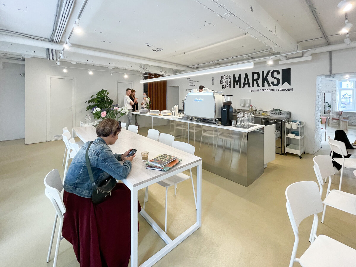 Теперь в этом районе пять кофеен: «Кава и Кветки», «Параграф», «Мануфактура», через месяц на углу откроется «Поль». Проект кофейни «Зерно» удачно заехал в переехавший «Сон Гоголя» в жилом доме за шлагбаумом на улице Карла Маркса, 11. Симбиоз нарекли философско – «Маркс», но тогда почему кофе для народа не за коммунистическое рукопожатие, а по 9р за капучино на растительном молоке? Шучу! Последняя их кофейня открылась на улице Ленина в интерьере разбитых стен. Скажем так, на очень-очень большого любителя старых подъездов в сталинках. Следующая будет на Киселёва с другой стороны от эко-био-зож-вег-дог-френдли кофейни «Тиден». И ещё одна на месте сдавшегося «Оливье» на Интернациональной. Первое правило книжного клуба на Маркса – не упоминать о кофейне Зерно. Второе правило книжного клуба – не упоминать о Зерне вообще! Третье правило клуба – в бою участвуют книжный магазин и кофейня. АТМОСФЕРА Опять белые стены, жёсткие стулья, большой шведский коммунальный стол, зелень и через проём без д
