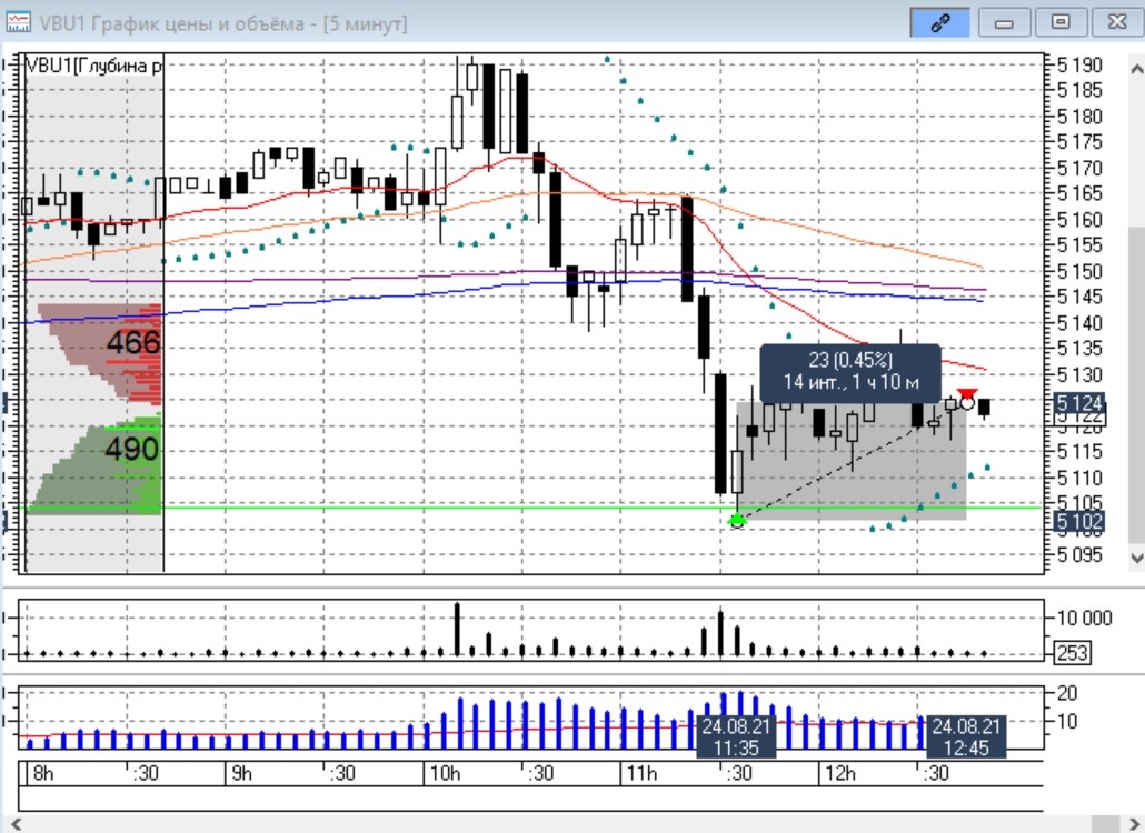 В основном я занимаюсь краткосрочными инвестициями, а вот полем для спекуляций я выбрал срочный рынок. Чем хороши фьючерсные контракты, тем что для покупки одного контракта, например, на акции банка ВТБ при стоимости фьючерса в 5100 руб. надо потратить гарантированное обеспечение (ГО) в размере 738 руб. Таким образом при росте цены контракта на 1% прибыль мы получаем: 5100 * 0,01 = 51 - это изменение цены контракта, 51 / 738 * 100 = 6,91 % - это прибыль. То есть прибыль от торговли фьючерсом почти в семь раз выше изменения цены самого контракта. Раньше я писал о торговле фьючерсами ВТБ, там за 3 дня прибыль составила 20%. Вчера контракт вошел в боковик, что является поводом для внутридневной торговли. Как всегда входим в сделку по заранее выставленному стопу на уровне предыдущего отскока. Вчерашние сделки: В итоге суммарное изменение цены по двум сделкам 49 руб., что составляет 6,6% прибыли. Сегодня: Пока 32 руб., это 4,3% прибыли. В итоге более 10% прибыли за два дня. Но торговая се
