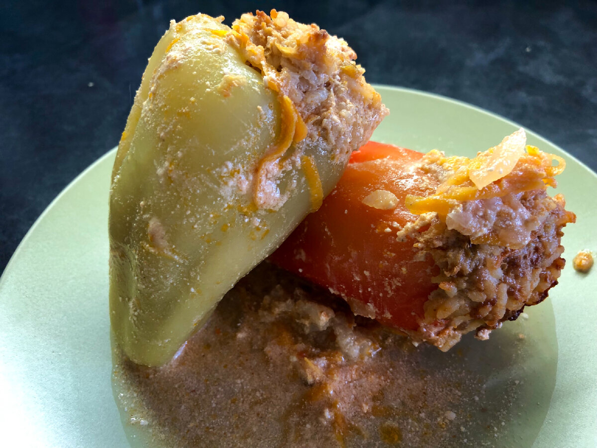 Ингредиенты: Сладкий перец - 12 шт. Морковь - 2 шт. Лук - 3 шт. Сметана - 1 уп 300 гр. Томатная паста - 70 гр. Рис - 1 стакан. Фарш 400 гр свиного фарша и 250 гр индюшиного фарша. 1. Промыть рис и поставить его вариться, до состояния полуготовности. 2. Перец помыть и удалить сердцевину, хорошо промыть перец внутри, что бы не осталось семян. 3. Одну луковицу натереть в фарш. 4. Две луковицы мелко нарезать и обжарить на небольшом количестве масла. Лук обжарить до мягкости и добавить к нему морковь, предварительно натертую на средний размер терки. 5. В фарш с луком добавить соль, перец и специи по вкусу, я добавляю специи к мясу. Затем добавить уже приваренный рис и половину зажарки(лук и морковь) Все хорошенько размешать. 6. В оставшийся лук и морковь добавить томатную пасту и сметану, добавить два стакана воды. Все хорошо размешать и добавить перец горошек, так же можно немного подсолить и добавить специи или смесь перца. 7. Перцы выложить в казан или кастрюлю с толстым
