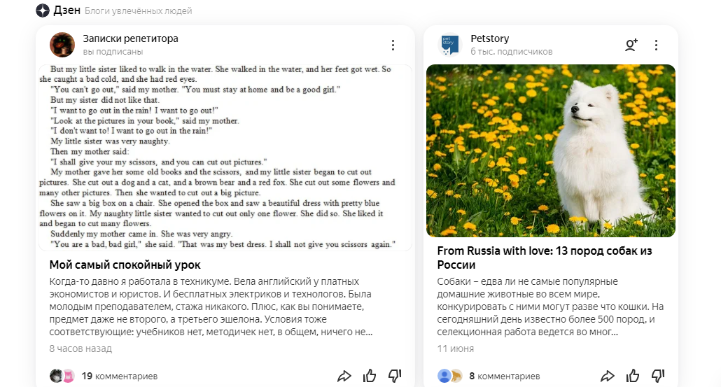 Эта история произошла летом, но написать о ней руки дошли только сейчас. Как вы все знаете, Дзен - это лента на основе "ваших интересов". Так как я являюсь автором Дзена, то волей неволей захожу на него каждый день. А потому и мне предлагается набор статей. И тут надо учитывать два момента, во-первых: я человек достаточно любопытный, а во-вторых: "чукча читатель". И потому меня привлекает конкретный текст без относительно того, насколько актуально это для меня на данный момент, главное чтобы было хорошо написано. И заинтересовалась я хорошим блогом "Записки репетитора", написано хорошо, интересно и с юмором. Вот только Дзен естественно тут же решил, что мне интересна именно эта тема и забросал меня статьями по образованию, воспитанию, школьным проблемам, экзаменам и дополнительным курсам. И хотя любопытство иногда подбивало меня на какую-нибудь статью кликнуть, в то же время я боялась, что тогда Дзен совсем погребет меня под темой, которая мне в принципе сама по себе не нужна. И в
