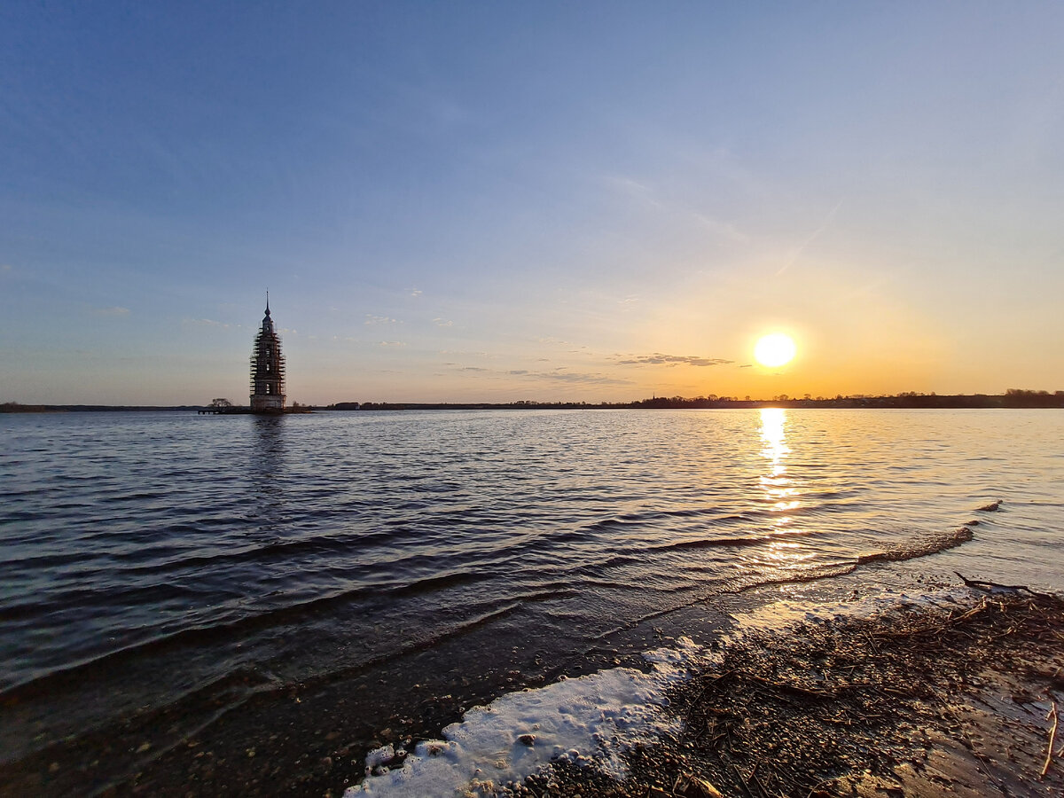 Несколько раз я проезжал мимо этой колокольни. Когда ездил в Рыбинск несколько лет назад и ещё куда-то когда-то давно - уже и не припомню точно. Видел издалека, на обратном пути планировал заехать, но, по классике жанра было некогда. Ну, в следующий раз уж точно, наивно полагал я. В этом году, наконец-то случился этот "следующий раз". Мы поехали с семьёй немного прокатиться по Золотому кольцу и путь наш лежал через Калязин. Повезло, что подъехали мы к ней на рассвете в ясную погоду - кадры получились красивые. Не повезло, что колокольня сейчас реставрируется и вся в строительных лесах. Столько лет с ней ничего не делали, а начали аккурат к нашему приезду! В целом выглядит интересно. Водная гладь, а посреди неё на маленьком островке стоит колокольня. Как же так получилось? Дело в том, что в 40-е годы при строительстве Угличской ГЭС и плотины, Волга сильно разлилась. Неподалёку отсюда под воду ушёл целый город - Молога. Часть Калязина также затопило, в том числе и главную площадь город