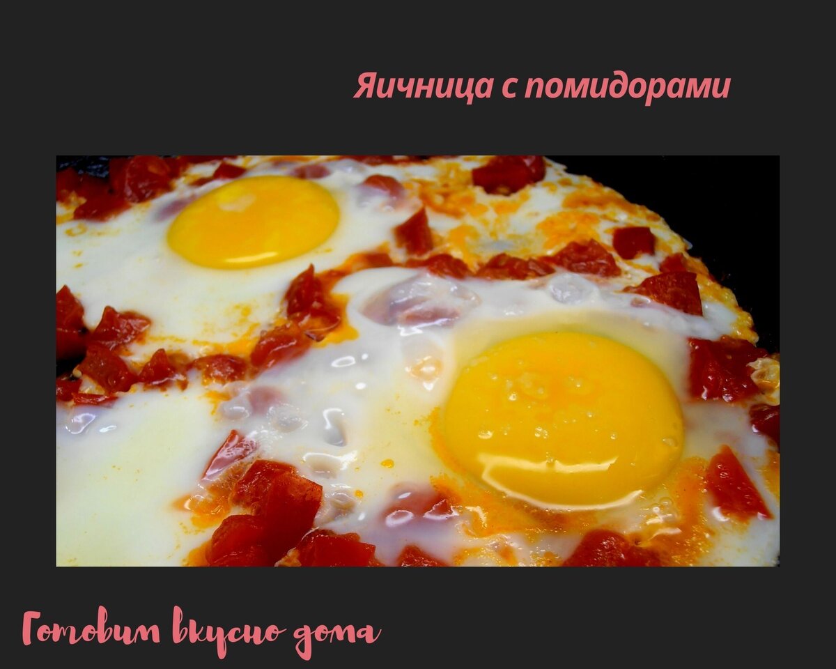 Помидор нарезаю на мелкие кубики. В сковороду наливаю масло, затем кладу нарезанные помидоры, подсаливаю и тушу на медленном огне пару минут под крышкой, потом вбиваю яйца, солю и перчу. Жарю до готовности белка. Приятного аппетита!