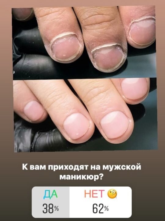 Гигиеническим мужским маникюром, кажется, никого не удивить. В России и за её пределами есть мастера маникюра, у которых он представлен в прайсе и они с удовольствием работают с мужскими руками. Мужчины же в свою очередь присматриваются к ухоженным рукам без разорванной в мясо кутикулы и ногтей, которые подстригались методом сгрызания, и начинают привыкать к такой процедуре. Становится ли это частым запросом? Пока непонятно, в аккаунте imkosmetik мы спросили у мастеров, как часто их процедуры посещают мужчины и 62%, ответили, что их не посещают вообще. Возможно, проблема кроется в боязни самих клиентов посетить такие процедуры, а может, есть мастера которые не могут или не умеют такую услугу предлагать? Ранее мы писали о том, как предложить уходовую процедуру мужчине и вот самые главные правила: Согласитесь, мы часто не указываем эту позицию, а рассказать клиентам о своих услугах очень важно. Если мужчина захочет прийти к вам и не увидит такой позиции в прайсе, вряд ли он спросит у ва