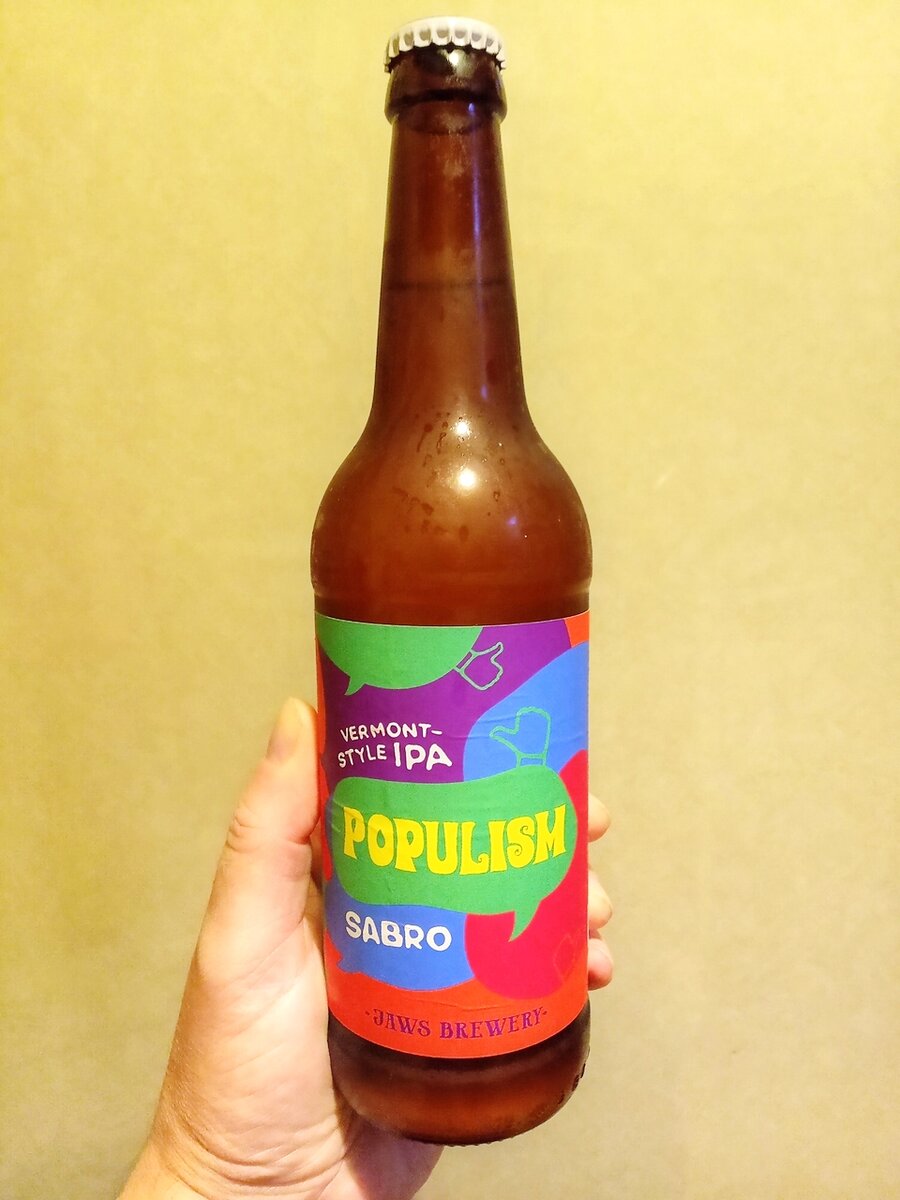 Т.е. попробуем пиво из линейки Populism пивоварни Jaws Brewery из города Заречного Свердловской области. На данный момент линейка состоит из девяти видов пенного в стиле NEIPA, сваренного с применением различных сортов хмеля. Мне пока что довелось попробовать только три вида пива. И все три сегодня и рассмотрим. Для cвeжeй вepcии Рopulism мы выбpaли североамериканский хмель Sabro, излучaющий apoматы мандapинa, kokoca, тропических фpykтов и косточковых ягoд. До окончания срока хранения пиву оставалось шесть дней... ТТХ: Пиво мутное, непрозрачное. Пены мало, оседает шустро. В аромате тропики, цитрусы и немного кокоса. Во вкусе тропики с цитрусами конкретизируются - манго и мандарин. Кокос тоже присутствует в небольшой дозе. Едва заметная сладость перебивается более заметной мягкой горечью, остающейся в длительном тропическо-цитрусовом послевкусии. Пиво довольно сочное. Пьется отлично. Вполне достойный мутняк, скажу я вам. До шедевральных творений Заговора чуток не дотягивает, зато стоит