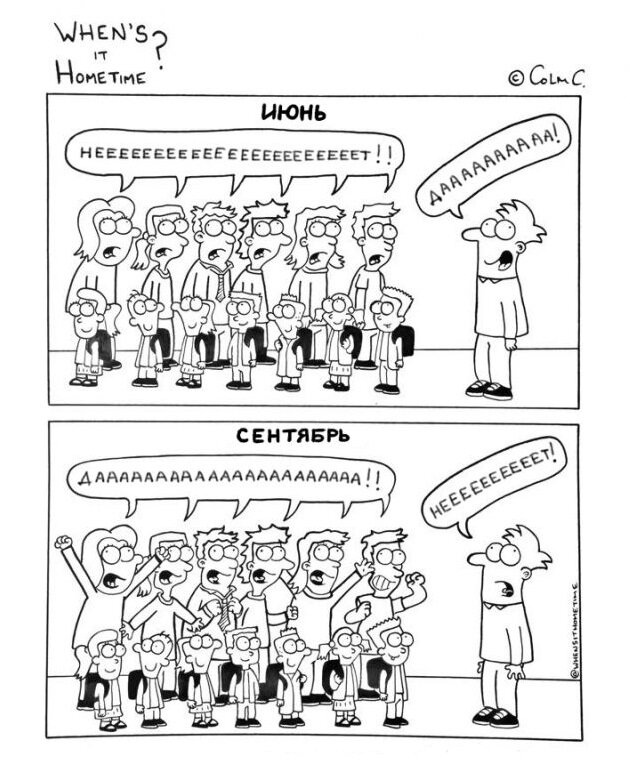 Привет, дорогой друг! Я не мог обойти своим вниманием такое значительное событие как 1 сентября, поэтому сегодняшняя статья будет посвящена школьной поре. Надеюсь, что ты относишься к той категории людей, которые с теплом вспоминают события того времени. Но даже если это не так, в этой статье я собрал 10 поводов, которые помогут увидеть в школьных событиях #юмор . Если ты еще не догадался, то поясняю — сегодняшняя статья будет содержать в себе #комиксы , главными персонажами которых будут дети, родители и учителя. Я еще я был бы очень рад, если бы статья повеселила тебя настолько, что ты смог бы поделиться ей с бывшими одноклассниками. Для многих родителей начало учебного года — это облегчение, ведь теперь половину дня у детей будет занимать #школа , поэтому этот праздник они встречают с радостью. В отличие от учителей, у которых начинается напряженная работа. Художник Кольм Кафф заметил, что несмотря на существенные различия у учителей и родителей есть кое-что общее. Когда ты учишься