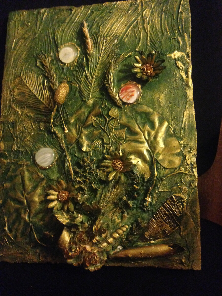 Это был размером, насколько я помню, 50Х50 см. Я использовала разные материалы для того, чтобы сделать этот #коллаж Это были натуральные #сухоцветы и искусственные #листья и марблс . У меня оставались с давних времен какие-то #экзотические растения , которые я купила в засушенном виде. Туда пошел даже срез от натуральной мочалки, который я покрасила, а потом поверх прошла контуром. Все это вживлялось в шпаклевку с клеем ПВА. После того, как картина была покрашена в зеленый цвет, я губкой оттенила выступающие места с помощью золотой краски. Сбоку видно выступающие детали композиции. Я подумала, что лучше она будет смотреться без рамы. Тем более, что это сделано на деревянной основе.. Потом я подарила ее подруге. Эту работу я назвала "Воспоминание о Черном море". Из чего сделано - видно. Только сухоцвет нашла за деревней. Работа тоже достаточно большого размера, примерно 50Х40 см. Ее я тоже подарила знакомой женщине на юбилей ее творческого коллектива. К тому же, накануне она как р