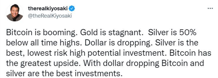 Роберт Кийосаки назвал биткоин и серебро лучшими возможностями для инвестиций в 2021 году, а вот золото его пока не радует 🤑 Он объяснил свой выбор недоверием к ФРС и фондовому рынку. Кстати, прогноз Роберта о падение BTC до $24 000, где он собирался его покупать, так и не сбылся, как минимум пока... Я думаю что уже не сикрет то, что биткоин в этом году и гредущем покажет финаминальный рост. Но я не советую покупать его. Лучше купить альт коины, цена которых зависит от курса биткоина. Купив альткоин, который стоит дешевле. Он может вырасти на 300% + Когда биткоин в 2-3 раза.