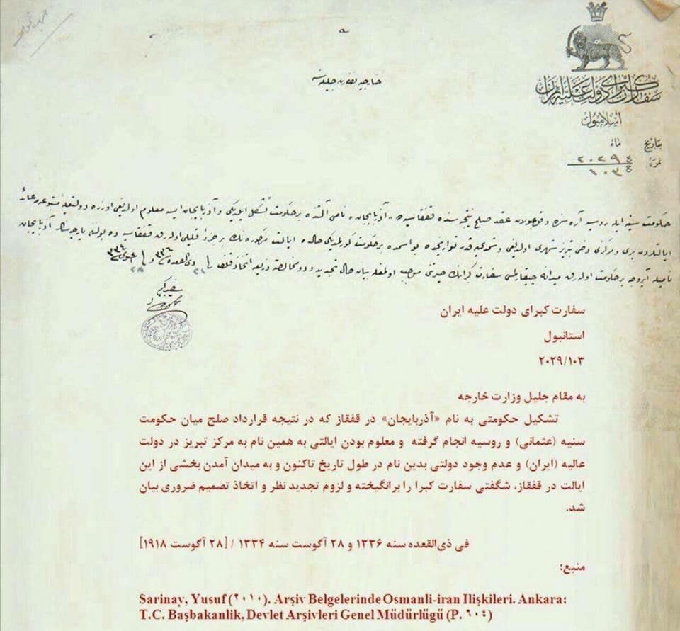 28 августа 1918 года посольство Персии (Ирана) в Стамбуле подало письмо протеста против создания государства под названием «Азербайджан». В письме говорилось: «Уважаемый МИД! В результате подписания российско-османского мирного договора на Кавказе формируется государство под названием «Азербайджан». Учитывая, что в границах государства Персия есть территория, с центром Тебризе, с таким названием, которая в истории никогда не была государством с таким названием. Персия удивлена, и видит необходимость пересмотра этого решения. Посольство Персии 28 августа 1918 г.» PS Обязательно дайте всем об этом знать, чтобы каждый мог увидеть и понять, что все, чем бредит Алиев, его машина пропаганды и терроризма в связи с топонимами некоторых населенных пунктов в Армении, как если бы они были в то время азербайджанскими, не только абсолютная ложь, но и просто ставит Алиева и его лоббистов в позорное положение, перед международным сообществом, не говоря о босоногой и голой азербайджанской машины пропа