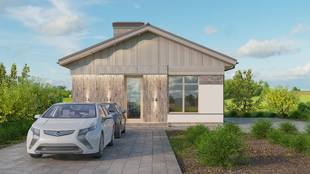 Сколько нужно квадратных метров для счастья? На этот вопрос нет правильного ответа. Но в данном случае хватит и 75, если семья состоит из родителей и ребенка. В доме нет ни грамма бесполезной площади, т.е. коридоры отсутствуют напрочь. И в принципе этот дом реальнее потянуть чем 250 м2. Дом чуть меньше 9 метров по ширине - для узких участков. На фоне авто дом смотрится ни чуть ни как малюткой. Благодаря большим окнам в доме будет светло и приятно находиться. Двухскатная крыша - залог экономии на материалах.