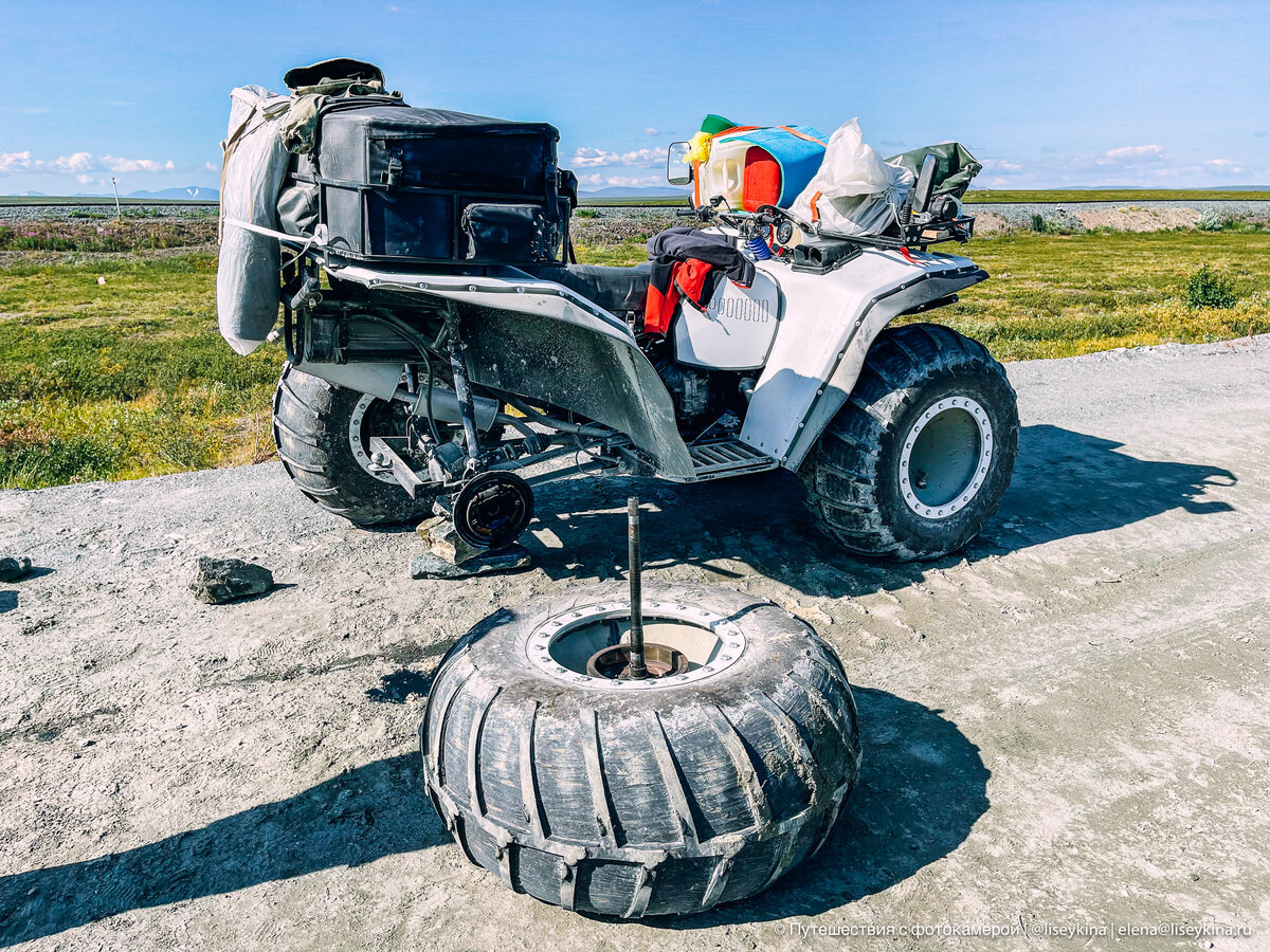 Никогда бы не подумала, что моё летнее путешествие на Полярный Урал начнётся именно так. Но что было, то было. Вы когда-нибудь видели, как у квадроцикла во время движения на скорости около 50 км/ч задняя ось "отъезжает" в сторону? Вместе с колесом... Вот и я за 15 лет автомобильных поездок увидела такое впервые. У меня вообще никогда раньше колесо не отваливалось. Что имеем в результате? Колесо с осью - отдельно, квадроцикл Baikal 4x4 - отдельно. Оказалось, что при сборке стопорное кольцо просто "повесили" на ось, а надо было использовать метод горячей посадки.