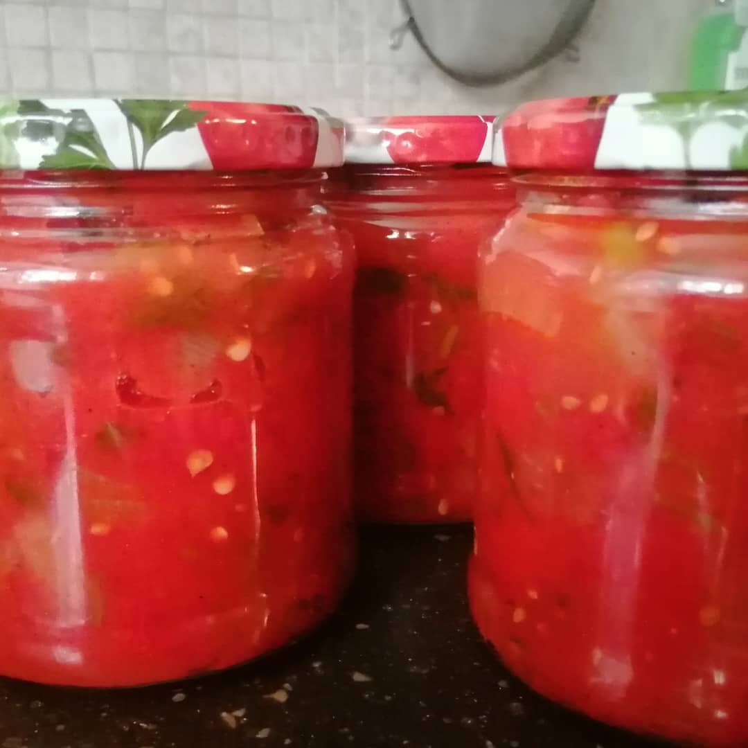 Привет, Друзья! Варенье из сладкого перца для себя любимых мы сделали. Посмотреть рецепт можно на моем канале по ссылке https://zen.me/27oRqp Потому сегодня давайте сделаем что-нибудь вкусненькое и согревающее для своих мужчин. Будет острый перец в томате. Как готовим Лук обжарить до готовности. Помидоры измельчить на мясорубке и добавить к луку. Туда же соль и сахар. Дать закипеть и оставить кипеть на медленном огне 20 минут. Опустить неочищенный острый перец в томатную массу. Кипеть масса должна до тех пор, пока перец не утонет в томате. Вливаем уксус, даем закипеть и сразу разливаем по стерилизованным банкам. Приятного аппетита! Надеюсь мой рецепт понравится и Вам! Друзья, если вам понравился рецепт, ставьте лайки и комментарии и подписывайтесь на мой канал. У меня ещё много вкусных рецептов, которые и Вам нужно попробовать! 🍅🌶🧅🍅🌶🧅🍅🌶🧅 помидоры - 1 кг, острый перец – ориентируйтесь на томатную массу, перец кладете до тех пор, пока томатная масса его закрывает, лук репчатый