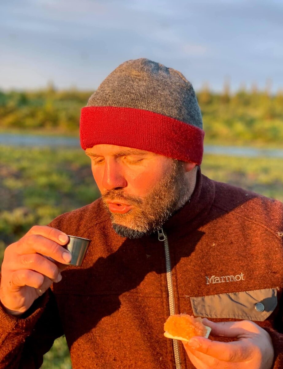 Вот я часто слышу вопрос чем вы питаетесь в тундре? Тут конечно однозначного ответа нет.., еда в тундре аскетична и однообразна.., но надо смотреть меню на какой-то конкретный день.. Ну вот например четверг - рыбный день: 1 Завтрак. Застывшая Уха-холодец, что не доели с вечера; 2.Обед. Копчёный хариус; 3.Полдник. Запечёный хариус; 4.Ужин. Роллы с охлаждённым на снежной шапке Гольцом; 5.Поздний завтрак. Галеты со свежепросоленной икрой кумжи и чистой речной водой, для перестальтики желудка..
