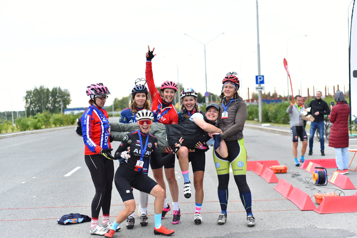 Еду, оборачиваюсь, группа не торопится, доезжаем до горки перед финишем и за мной в погоню устремляются перспективный и легкий молодой гонщик из нашей команды Миша Русских и опытный Валерии Постнов из Новосибирска. На середине подъема они меня догнали, а перед выходом на финишную прямую к нам подкатили и фавориты гонки, но Михаил молодец, поборолся и забрал 10 бонусных секунд, я же не смог додавить хотя бы до третьей позиции. Далее группа продолжает спокойное равномерное движение. В отрыв уходят Андрей Воронков и Караханов Саша, который через 3-4 круга возвращается в группу, а Андрей продолжает ехать разделку на приличной скорости то отрываясь от группы, то немного приближаясь к ней. В итоге Андрей спокойно забирает 10 бонусных секунд на 10-ом круге. За 7-ю секундами в финишную горку в отрыв уходит Меер Андрей, на что группа ничем не отвечает, а продолжает размеренное движение. Выходя на финишную прямую, я предпринимаю попытку забрать 5 бонусных секунд и группа