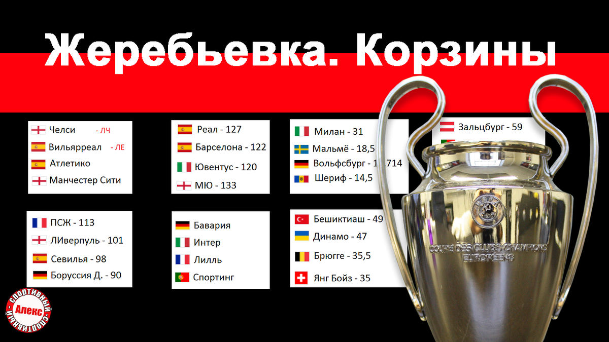Здравствуйте, уважаемые любители футбола. В Лиге Чемпионов определены все 32 участника группового этапа сезона 2021/2022. Испания получила 5 клубов: "Атлетико", "Реал", "Барселона", "Севилья" и победителя Лиги Европы "Вильярреал" 4 представителя у Англии : "Манчестер Сити", "Манчестер Юнайтед", "Ливерпуль", "Челси"