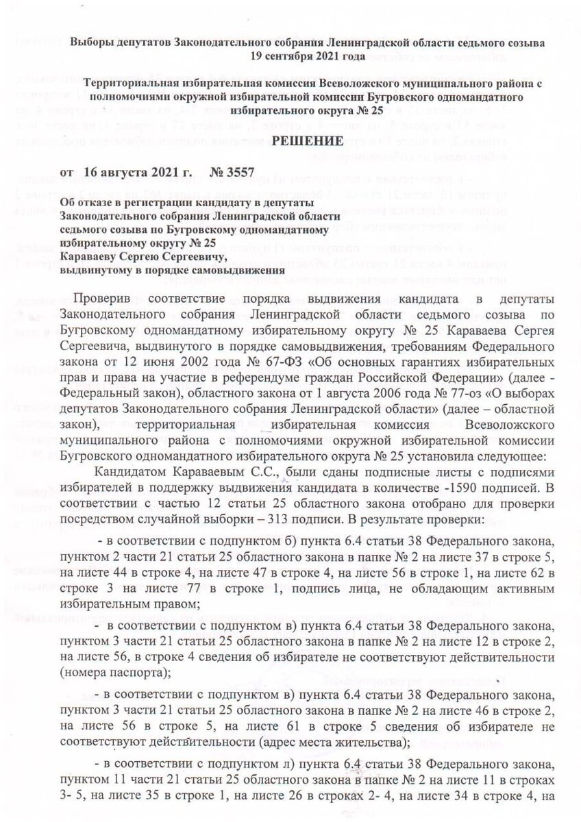 Сегодня получил отказ в регистрации на очередные выборы в ЗакС ЛО