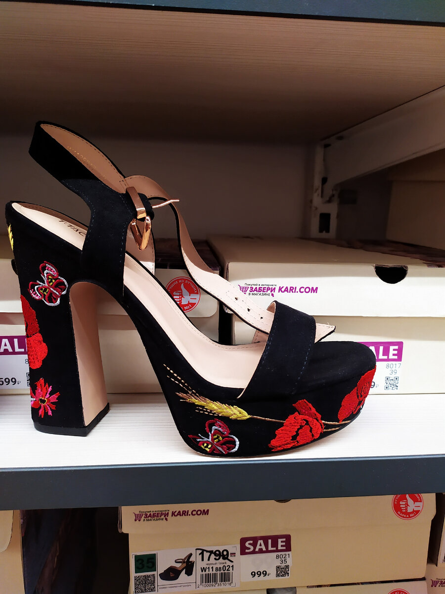 Конец августа, а в KARI на летнюю женскую обувь вновь снижают цены, чтобы всё распродать. Я помню босоножки которые стоили ещё в мае 1999 рублей, сейчас на полке уже за 599 рублей. И так практически все модели. В этом обзоре хочу предложить вашему вниманию летнюю женскую обувь, которую я заметила в это посещение KARI города Крымск. Чёрные замшевые босоножки с цветочным ярким рисунком на высоком устойчивом каблуке. Цена 599 рублей. Белые тканевые сандалии на толстой подошве и застёжкой на липучке. Цена 999 рублей. Синие сандалии с массажной стелькой и перфорацией. Цена 999 рублей. Чёрные замшевые босоножки на высоком устойчивом каблуке. Цена 799 рублей. Бежевые босоножки на средней платформе. Цена 799 рублей. Жёлтые босоножки на танкетке и прозрачным ремешком на носке. Цена 999 рублей. Бежевые босоножки с чёрным закрытым носком на толстом каблуке. Цена 799 рублей. Серые шлёпанцы с блеском и декоративным украшением из блестящих шариков. Цена 999 рублей. Серебристые босоножки на шпильках.