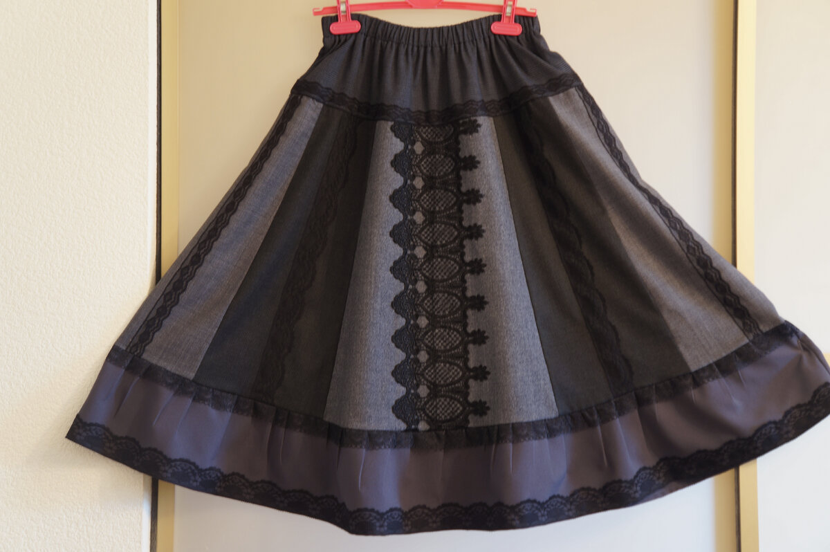 Куски раскроила в клинья, ткань разная по фактуре, шерсть и полушерсть. Пристрочила по середине клиньев разное капроновое кружево. На переднем полотне пришила самое красивое вискозное кружево, один единственный кусочек был в наличии. Пришивала вручную. Сверху пришила кокетку, внизу подошла костюмная ткань не шерстяная, чтобы на длину нужную выйти. Получилась очень красивая юбка из множества остатков шерсти. В юбке участвовало 5 видов ткани и 4 вида кружева.