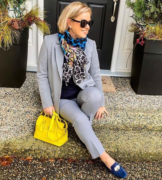 Брючный костюм – выгодная инвестиция в возрастной гардероб. Это отличная база для создания образов в стиле кэжуал, деловых и вечерних ансамблей. Ниже 10 элегантных осенних сетов для женщин старше 50. Смотрим и вдохновляемся! Отдавайте предпочтение однотонным брючным костюмам. Серый цвет, как и черный, относится к разряду базовых, но он смотрится гораздо мягче и уютнее. Чтобы сделать образ ярче, дополните его принтованным шарфом и акцентной желтой сумочкой. Вместо шарфа можно использовать платок, прямоугольный или квадратный, главное, чтобы хватало длины. Пропускаем его под поясом, подчеркиваем талию контрастным поясом и динамичный городской аутфит на осень готов! Монохромные образы красноречиво говорят о безупречном вкусе и чувстве стиля. Одним из самых популярных цветов для монохромных комплектов является бежевый. При желании total look можно разбавить сумкой приглушенного мятного оттенка. Стильно, свежо, актуально! Темно-синий костюм прекрасно вписывается в расслабленные повседневные