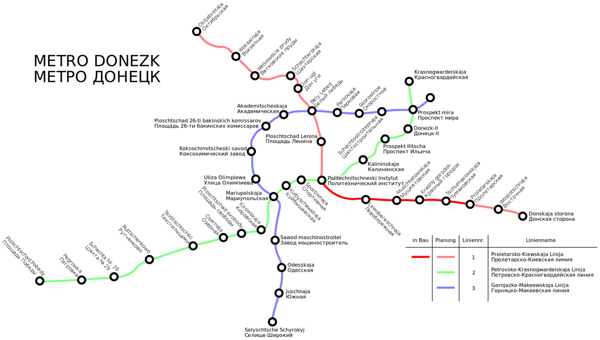 Привет всем я Димас 101 и это статья про Донецкий метрополитен , который не был построен из-за систематической нехватки финансирования сроки сдачи проекта постоянно сдвигались, а новые сроки сдачи не назывались. В 2013 году строительство было остановлено. В 1990 году ещё при СССР было принято решение начать строительство метрополитена в Донецке. По проекту стройка была рассчитана на 10 лет. Строительство начато в 1993 году , запуск первой очереди планировался в 2005 году, позже был назначен на 2011 год. Отказ от строительства Планы самопровозглашённой ДНР Строительство К ноябрю 2009 первая очередь (пять станций) была готова всего на 30 %. 1 декабря 2011 года министерство инфраструктуры отказалось от подземного метро в Донецке, однако пообещав построить надземное, которое обойдётся в 5-7 раз дешевле. Также был предоставлен новый генплан Донецка. По нему резко сокращается количество станций строящегося метро, отсутствует «Горняцко-Макеевская» линия. Пока с вами был Димас 101. Увидимся в