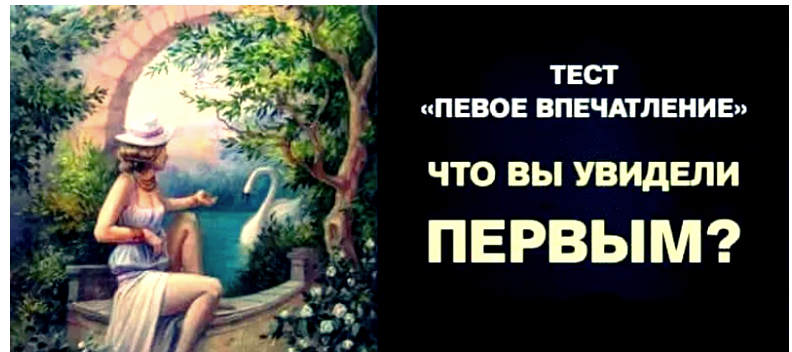 Здравствуйте Уважаемые подписчики и гости канала. Для Вас мы приготовили еще один интересный психологический тест по картинкам. Тест по первому впечатлению раскроет главные черты вашего характера, а также предскажет некоторые события в ближайшем будущем. Все, что вы должны сделать – бросить взгляд на картинку. Не ищите что-то особенное, ваш ответ должен лежать на поверхности. Именно первое впечатление сделает тест наиболее точным. Итак, посмотрите на изображение. Что первым бросилось вам в глаза? Результаты теста: Вы увидели сидящую девушку Если сидящая в полоборота девушка, которая тянется к лебедю, первой бросилась вам в глаза, тест говорит, что в вас сильно развита романтика. Вы – разносторонняя личность и любите романтические приключения. Хотя вы можете казаться легкомысленным человеком, но это не так. Просто вы любите новые открытия и знакомства, но скука забирает у вас радость жизни. Продолжайте осваивать новые горизонты – тест предсказывает вам удачу в делах. В вашей жизни вот-в