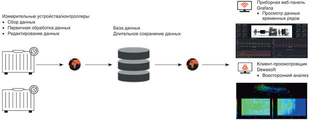 Служба Dewesoft Historian – это программное решение, с помощью которого база данных создается в «облаке». В эту базу данных стекается вся информация с контроллеров или измерительных устройств системы мониторинга (рис. 1), а пользователь получает доступ к этой базе данных через веб-браузер или специальное программное обеспечение, предоставленное компанией (один из компонентов Dewesoft Historian).