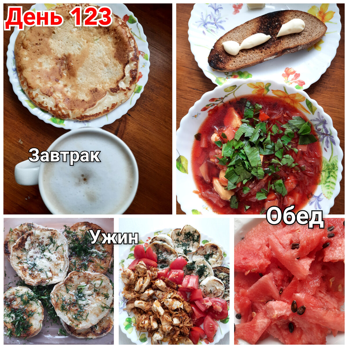 #Завтрак – цикорий с #ароматизированными сливками (описание в дне 119) и сахзамом. #Сырнаялепешка с луком. 1 яйцо+100 мл кефира+50г муки+соль, мешаем. 50г сыра (я его теперь делаю в виде заготовки – в комбайне измельчаю, часть замораживаю, часть в контейнер и в холодильник), режу лук, все смешиваю. На сковороду без масла, с каждой стороны до румяной корочки. #Обед – обожаемый мной #борщ - филе курицы (много филе, так что борщ почти белковый на треть) режу на мелкие кусочки и ставлю вариться в кастрюле с водой минут 15. Делаю зажарку из моркови и лука (это все замороженное). Чищу несколько средних картошек, режу. Добавляю все вместе - свеклу тертую, зажарку, картошку и свежую капусту. Свеклу я не обжариваю. Варю все вместе еще минут 15-20 до готовности картошки. В конце солю, пробую, добавляю зелень. К борщу – хлеб обжаренный на сковороде, так как пластины гриля были в мойке, майонез 8г, чеснок. Я забыла посчитать КБЖУ борща, потому что те варианты которые есть в программах не вызывают