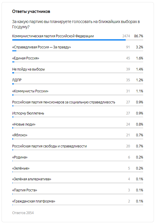 Конечно, мой опрос не является репрезентативным, и не может отражать мнение всех жителей страны. Но такой отрыв коммунистической партии от всех остальных, мягко говоря, поражает.