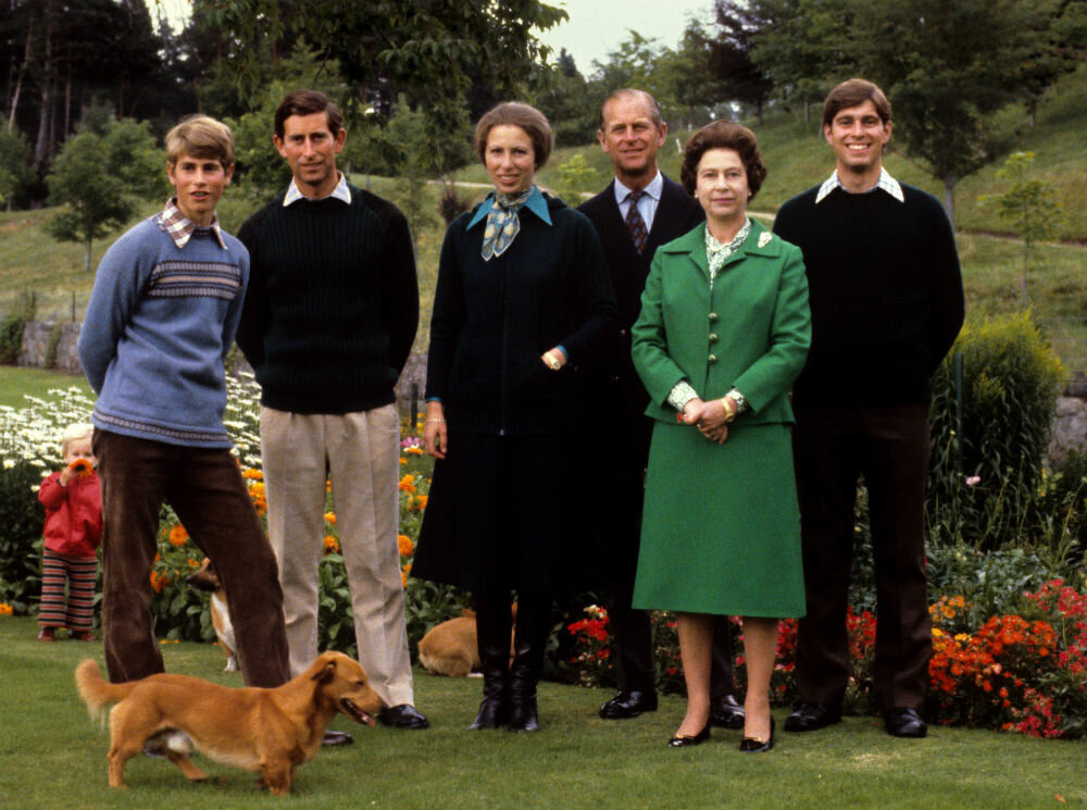 Принц Эдвард, принц Чарльз, принцесса Анна, принц Филипп, Елизавета и принц Эндрю в Балморале, сентябрь 1979