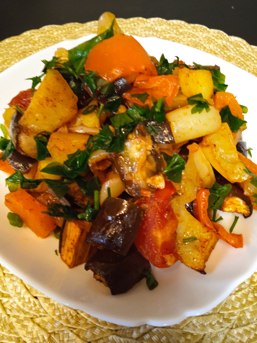 Нет нужды говорить о пользе овощей, и их благотворном влиянии на организм человека. В любом упоминании о правильном питании самой первой рекомендацией является обязательное употребление 500 граммов любых овощей в пищу в день.А когда, как не сейчас,когда на рынках царит изобилие разнообразных свежих овощей, употреблять их в пищу? Сейчас овощи содержат максимальное количество витаминов и минералов, так что можно перейти на питание только овощами и фруктами. Существует множество овощных блюд, но как по мне, самое простое -это запечь их в духовке. Определённого состава овощей для запекания нет, какие у вас есть в данный момент, те и используйте. Овощи для рагу можно брать любые:это картофель, морковь, сладкие перцы, кабачки, баклажаны, капуста разных видов, грибы, лук, чеснок,помидоры, сельдерей, репа, тыква и другие. Овощи необходимо помыть, нарезать средними кусочками. Молодые овощи , такие как кабачки, картофель, баклажаны можно не очищать от кожуры- это дополнительный источник