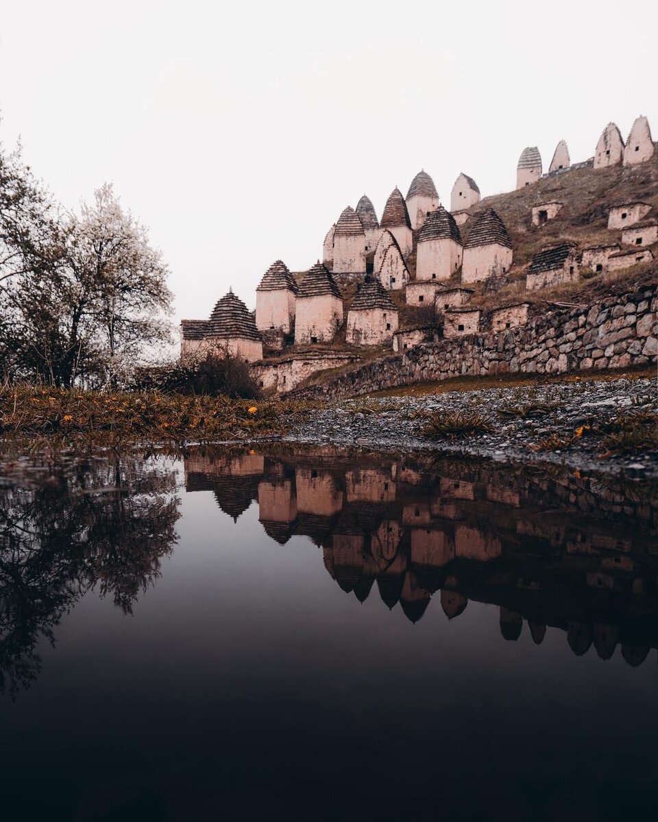 Нет, это не название очередного хоррор фильма про зомби, как может показаться сначала, а одно из знаменитейших мест республики Северная Осетия. Место с поистине жуткой атмосферой, ведь очень долгое время местные жители отказывались посещать его, поскольку верили что назад пути им не будет. Город мертвых - некрополь Северного Кавказа У селения Даргавс Северной Осетии расположен самый большой на северном Кавказе комплекс склепов, подземных и надземных захоронений, который и носит название "Город мертвых". Могильник не имеет какой бы то либо четкой структуры и застроен очень хаотично, всего на территории захоронения располагаются 95 сооружений. Все сооружения построены из грубо отесанного камня и были возведены в районе 14-18 веков. Город, уже долгое время является одним из главных туристических мест республики и продолжает привлекать все больше и больше туристов, но это вызывает много недовольства среди жителей республики, поскольку часто происходят кражи разных предметов с территории