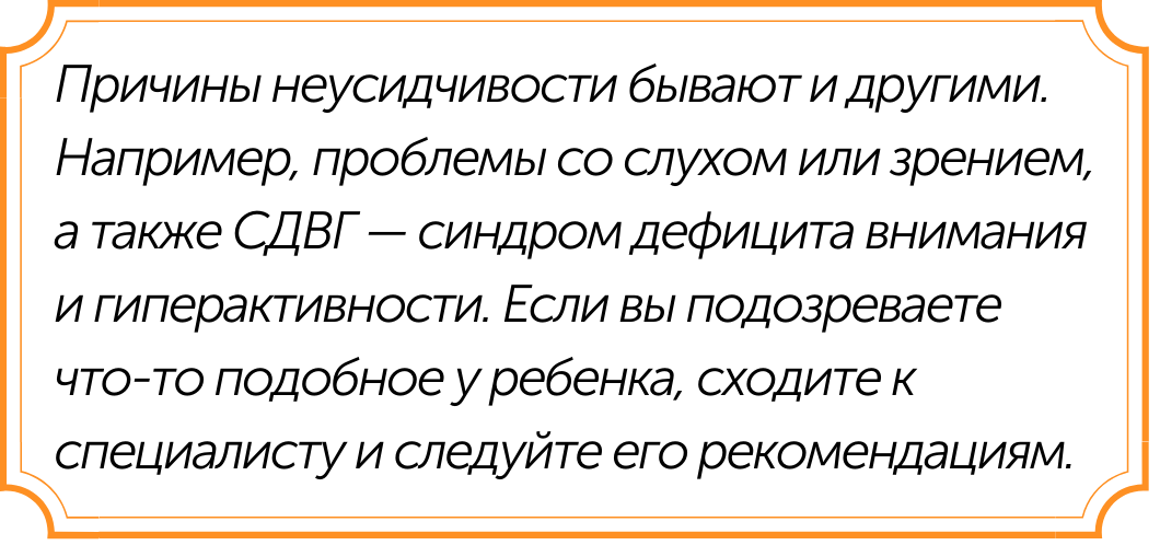 Невнимательность и неусидчивость детей может быть связана с самыми разными причинами. Может, задания кажутся ребенку слишком сложными или ему, наоборот, скучно их выполнять. Это может быть связано с нелюбовью к какому-то предмету. Мы собрали 5 советов, которые помогут ребенку стать более усидчивым. Как сделать так, чтобы ребенок не отвлекался Для того, чтобы «усмирить» детскую неусидчивость, нужно общаться с ребенком определенным образом. Ниже — пять советов от детских психологов. Совет №1 Все высказывания, которые касаются уроков или другой работы, должны быть в позитивном ключе. Вот пример: Высказывание с негативным окрасом: «Петя, не отвлекайся, а то ни в какое кино сегодня не пойдешь!» Высказывание с позитивным окрасом: «Петя, давай допишем эту страницу и пойдем погуляем». Совет №2 Неусидчивым и активным детям сложно долго удерживать внимание на чем-то одном. Поэтому задачи, в том числе уроки, нужно разбивать на небольшие фрагменты. Идеально, если поначалу ребенок будет отдыхать к
