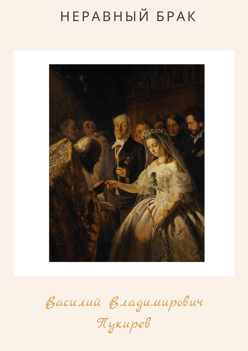 Замужество... Интересная конечно вещь, но не мне об этом рассуждать, возраст ещё не подобает, точнее опыт, а не возраст 😉 Но вот порассуждать на тему сюжета картины Я всегда могу с удовольствием!) Как Вы могли уже догадаться, тема сегодня пойдет о полотне Василия Владимировича Пукирева "Неравный брак"... Весьма непростая тема для написания, не правда ли? Разберемся.. Итак, по сюжету все конечно грустно, но тем не менее просто У нас есть молодая девушка и её не молодой муж, явно кто-то из них против этого союза, вокруг стоит немалое количество народа, что наблюдают за рождением новой ячейки общества, как любила говорить моя преподавательница по обществознанию. Тем конкретнее к деталям 1. Разделение картины по диагонали С одной стороны стоят люди, которые излучают негатив, их усмешки выражение лица, абсолютно все диктует нам о том, что для них услада все, что происходит сейчас.. С другой стороны: милая девушка, во взгляде которой читается грусть о надвигающейся на неё судьбы.