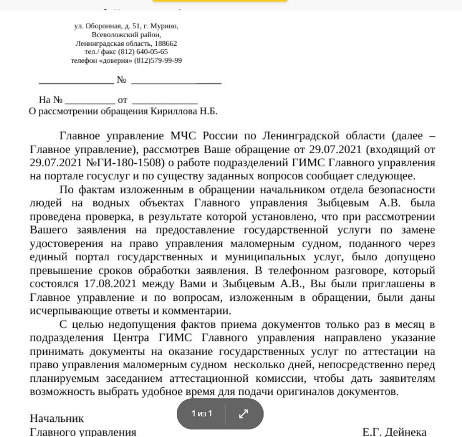 Главное же в том, что состоялся личный обстоятельный разговор с ВрИО Главного государственного инспектора по маломерным судам Ленинградской области, в котором я получил более подробные объяснения.