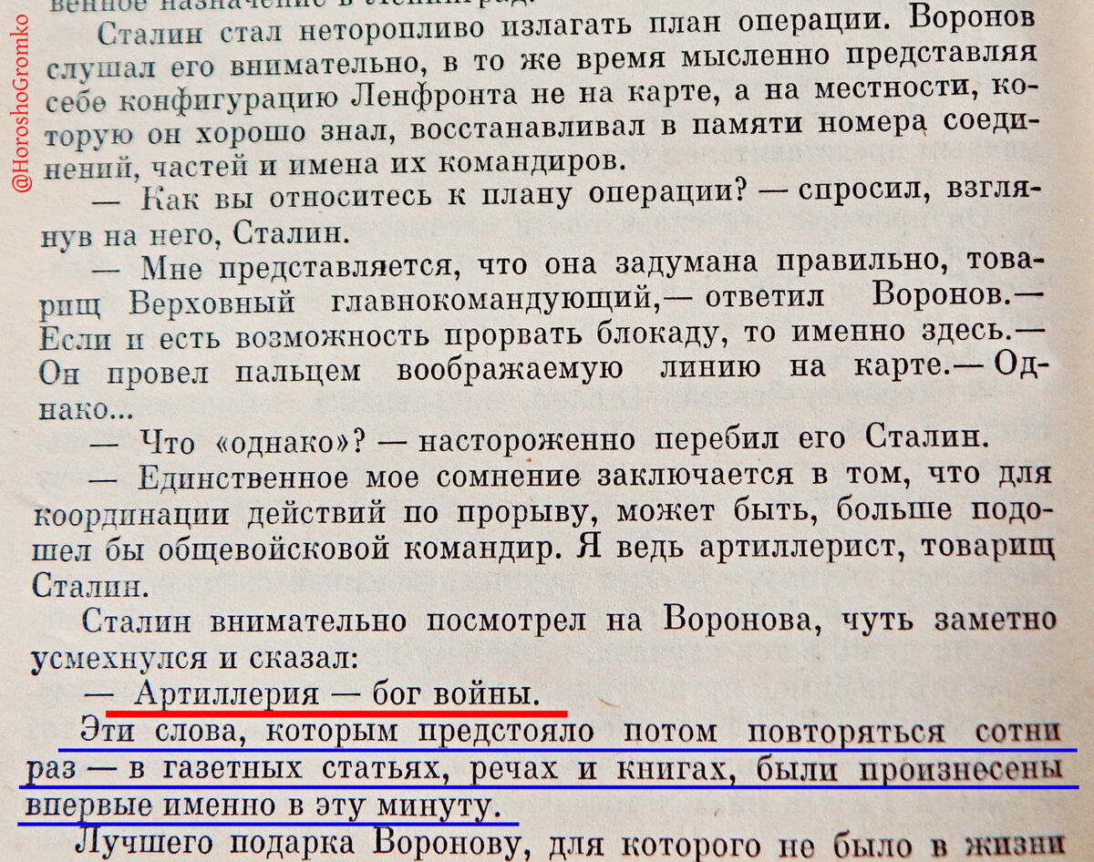 Знаете, когда и как родилось знаменитое Артиллерия - бог войны? Вот отрывок из романа Александра Борисовича Чаковского «Блокада». «Блокада» про Ленинград и Великую Отечественную. Роман начинается весной 1941 года и заканчивается с прорывом блокады в январе 1943-го. Книга во многом основана на реальных событиях, выдающееся произведение литературы, познавательная, рекомендую в высшей степени. А с крылатой фразой про артиллерию дело обстояло так: в сентябре 1941 г. кольцо блокады вокруг Ленинграда замкнулось. В начале октября Сталин поручил зам.наркома обороны и начальнику артиллерии Красной Армии генералу Воронову отправиться в город полномочным представителем Ставки и координировать первую операцию по прорыву блокады. Тот в ответ предложил отправить вместо себя военного более широкого профиля, а не узкоспециального артиллериста, на что Сталин ответил своё теперь уже знаменитое «Артиллерия - бог войны», и в Ленинград отправился-таки Воронов. А фраза вошла в историю. Немного о книге в