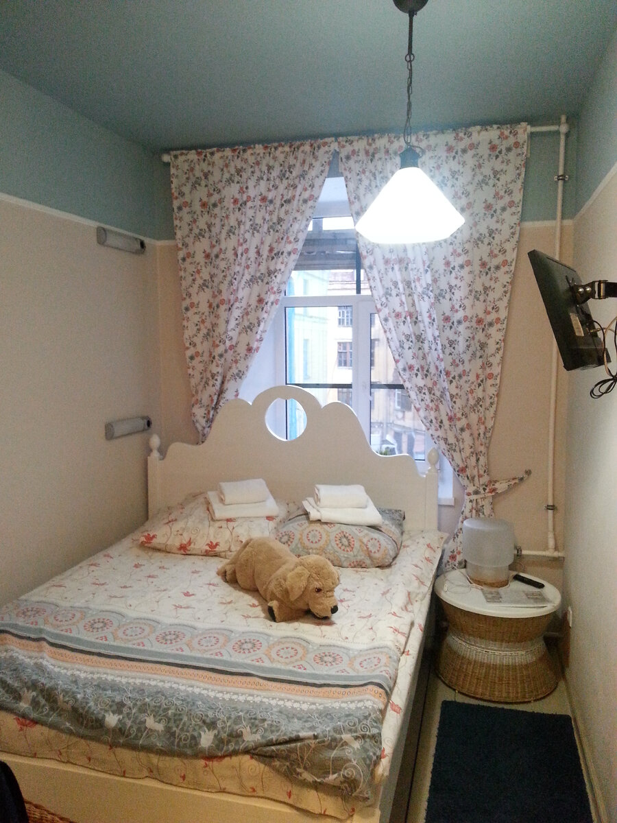 После посещения Васильевского острова, ледокола «Красин» и подводной лодки я вернулся в гестхаус «Друзья у Гостиного двора» и успешно заселился. В небольшом номере было все необходимое для туриста: удобная двуспальная кровать, телик, шкаф, журнальных столик и ванная комната с душем и туалетом. Все скромное, но со вкусом, особенно выделялась плюшевая собака на кровати.