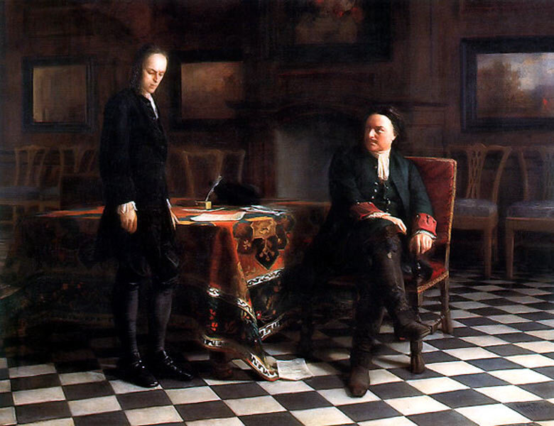 Неизвестно, что произошло доподлинно, но царевич начинает испытывать панический страх при общении с Петром Великим. Чтобы избежать унизительного экзамена при возвращении из-за границы в 1712 году, он даже стреляет себе в ладонь. Историографы это списывают на тупоумие и патологическую лень наследника престола… Очень сомневаюсь. Скорее всего, дело в нетерпимой атмосфере вокруг потерявшего все берега «непогрешимого императора».