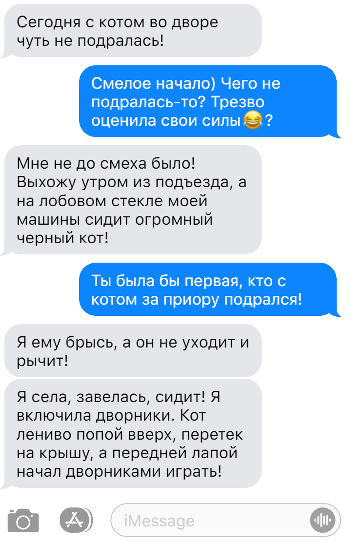 Я уже писала о котах разных: обожающих плотно поесть, ленивых, игривых. Сегодня хочу показать Вам переписки об абсолютно бесстрашных котах. Любители кошачьих подтвердят, что такие действительно существуют. А в этой семье кот пытается понять, что он умеет? Сначала в ванную с водой нырнул, теперь вот это: А в этой кошачье-собачье-человечьей семье принято ходить на родник втроем: старенькая таксочка Муля, сибирский кот Ганс (который выше Мули) и хозяйка. А в этой семье, видимо, не стоило называть кота мультяшным именем Том. Как и мультяшный персонаж, Том постоянно влипает в неприятности. Улыбайтесь каждый день! Новую статью "Смешные переписки о том, как сходили с собачкой в гости" читайте здесь. Если Вы можете - помогите нам в ежедневной заботе о брошенных кошках и собаках. Ваша помощь многим из них просто необходима. Для помощи брошенным кошкам и собакам - карта СБ 4276 4000 9548 8699 (оформлена на Светлану Геннадиевну К.), карта ВТБ 4893 4704 7605 7606 (я - Юлия Витальевна П.). Для PayP