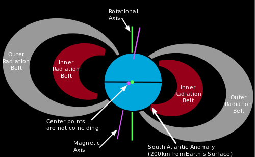 Вокруг земли есть 2 пояса заряженных частиц — так называемые радиационные пояса Ван Аллена: на высоте ~4000 км из протонов, и на высоте ~17 000 км из электронов. Частицы там движутся по замкнутым орбитам, захваченные магнитным полем земли. Также есть бразильская магнитная аномалия — где внутренний радиационный пояс ближе подходит к земле, до высоты 200км.