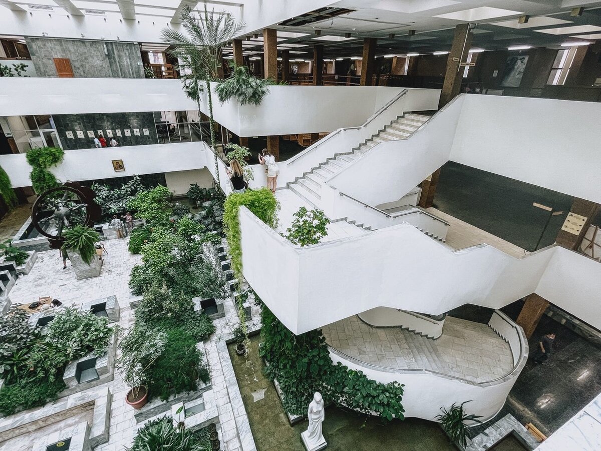 Ростовская Государственная Библиотека, оно из интереснейших зданий города, за грубыми фасадами здания, внутри скрывается белоснежное помещение с садами, живыми необычными растениями, настоящими действующими фонтанами и конечно же большая коллекция старейшего архива книг.