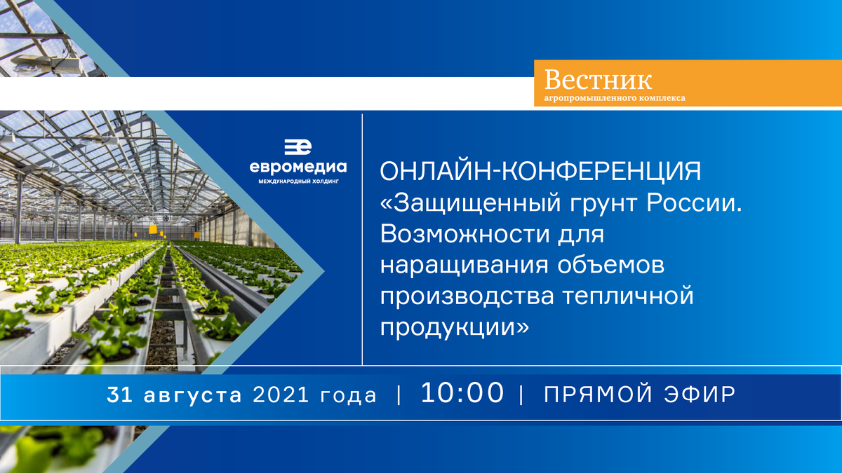 31 августа в 10:00 на базе общефедерального журнала «Вестник агропромышленного комплекса», издаваемого международным холдингом «ЕвроМедиа», состоится онлайн-конференция на тему «Защищенный грунт России. Возможности для наращивания объемов производства тепличной продукции» (на платформе Zoom). Вопросы, вынесенные для обсуждения: 1. Состояние и перспективы развития тепличных хозяйств в России. Меры государственной поддержки, направленные на стимулирование отрасли. Федеральный и региональный опыт. 2. Инвестиции в строительство современных и высокопроизводительных тепличных комплексов. Проекты, реализованные, реализуемые и планируемые к реализации в различных субъектах РФ. 3. Вклад тепличной отрасли России в импортозамещение продукции АПК. Примеры успешного решения задачи, связанной с увеличением доли отечественных овощей в торговых сетях и на рынках страны. 4. Возможности для наращивания экспортного потенциала тепличной отрасли России. Наиболее перспективные рынки сбыта в ближнем и дальне