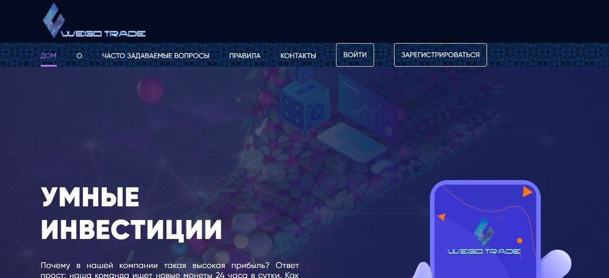 Wego Trade — контора, которая позиционирует себя как биржевую компанию по торговле на финансовых и фондовых рынках. Инвесторам предлагают открыть вклад на сумму от 20 долларов и начать зарабатывать от 2% в сутки. Вот только эти обещания невыполнимы. На подобных проектах можно только разориться. Рассмотрим Wego Trade подробнее и выясним, почему не стоит сюда вкладываться. Обзор проекта В легенде отмечается, что компания зарегистрирована в Лондоне. В обязанности менеджеров площадки входит выгодное проведение сделок на Форекс и криптовалютном рынке. Они выбирают только те варианты, благодаря которым удастся извлечь максимальную прибыль. Участникам проекта не нужно вникать в трейдинг. От них требуется только открытие вклада. Контакты: Инвестиционное предложение заключено в четырех программах с минимальным вложением 20-5000 долларов и заработком до 3,6% в сутки. По первой программе прибыль начисляется ежедневно, по остальным — каждый час. Тело депозита включается в выплаты. Открыть и закрыт