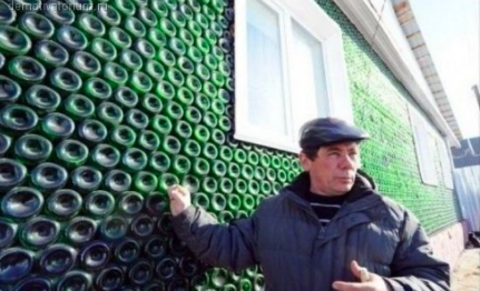 В деревне сосед решил украсить дом и полностью заставил бутылками из стекла. Кстати говорит, что таким образом они будут сохранять тепло + шумоизоляция отличная, ведь звук попадает меж бутылок и теряет силу. В общем одни плюсы, только вот где столько бутылок достать - большой вопрос. Ну и плюс если случайно камнем попадешь по стене, то можно без дома остаться