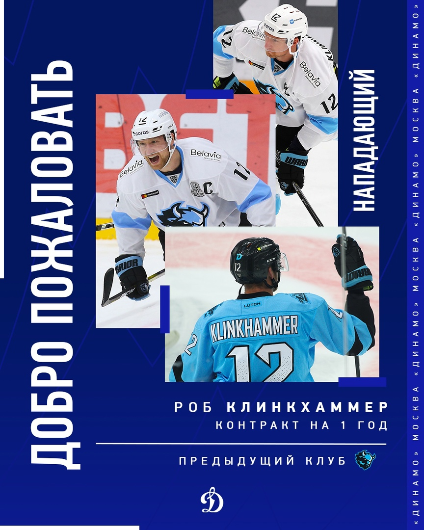 Канадский нападающий пополнил ряды бело-голубых Роб Клинкхаммер начал профессиональную карьеру в Американской хоккейной лиге (АХЛ). В сезоне 2007/2008 его дебютной командой стала «Норфолк Эдмиралс», в составе которой он провел 66 матчей, набрав 24 (12+12) очка. Следующие два года хоккеист выступал за «Рокфорд Айсхогс», привлекался в команду НХЛ «Чикаго Блэкхогс», однако там закрепиться хоккеисту не удалось, и на оставшуюся часть сезона 2010/2011 он вернулся обратно в фарм-клуб. Вторая попытка зарекомендовать себя в НХЛ состоялась через год в составе «Оттавы Сенаторз», но игрок перешел в фарм-клуб «Бингхэмтон Сенаторс». В 2016 году Клинкхаммер решил продолжить хоккейную карьеру в КХЛ и в статусе свободного агента заключил контракт с белорусским клубом «Динамо-Минск» сроком на два года. В новой лиге нападающего также ждала череда перемен — переход в «Ак Барс» в сезоне 2017/2018, «Авангард» в 2019/2020 и возвращение в Белоруссию в прошедшем сезоне. За минское «Динамо» Клинкхаммер провел 3