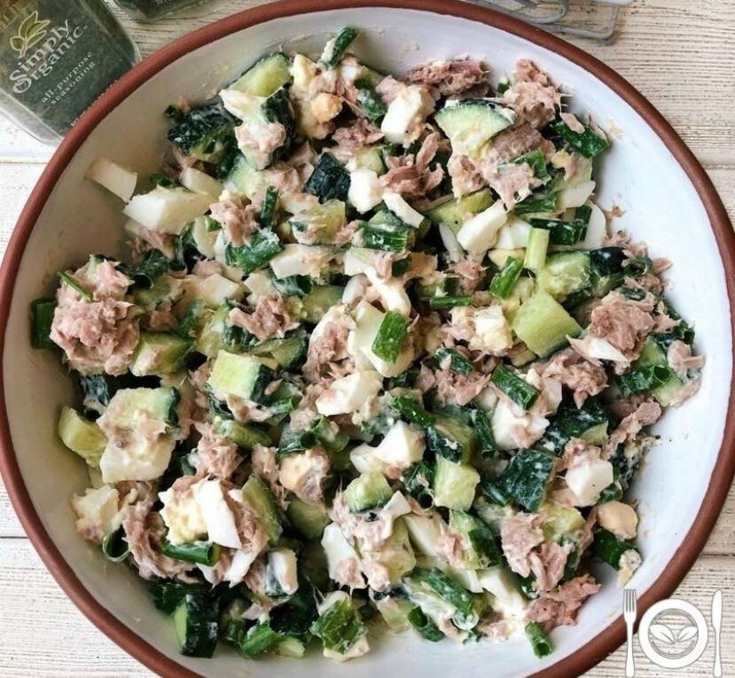 на 100грамм - 88.3 ккал Ингредиенты: 2 огурца ⠀ 1 баночка тунца с/с 3 яйца ⠀ 1 долька чеснока зеленый лук 2 ст.л сметаны ⠀ соль, перец, специи Приготовление: 1. Огурцы, зелёный лук, яйца нарезаем. 2. Из банки с тунцом сливаем воду, добавляем в салат. 3. Выдавливаем чеснок, солим, перчим, заправляем сметаной. ⠀ Приятного аппетита!