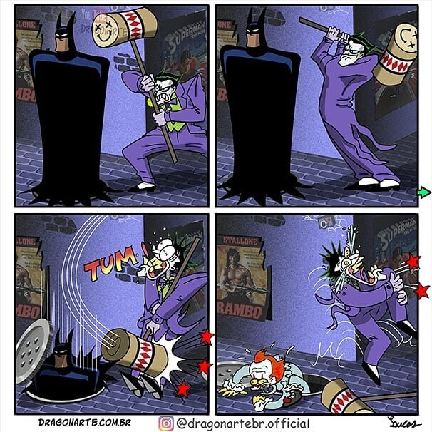 Художники создают много комиксов про супергероев, обычно это стандартные истории, о битвах со злом, противостоянии врагам, романтике, спасении мира и всем том, чем занимаются супергерои. Иногда автор комиксов решает отойти от общепринятой темы и нарисовать свое видение обычной супергеройской жизни. Бразильский художник комиксов Эдуардо Лукас Насименту, широко известный в интернете под ником dragonarte, придумывает безумные идеи, чем могли бы заниматься супергерои, в то время когда не спасают мир. Комиксы, полные курьезных сцен и глупых ситуаций, в которые художник помещает героев он размещает на страничке dragonartebr.official Существуют целые сообщества фанатов супергероев, люди создают группы и форумы, проводят встречи, делают косплеи и конкурсы, количество поклонников мира супергероев растет. Вместе с ним растет и популярность рисунков спин-офф, которые показывают что могло бы произойти с персонажами, помимо основной линейки приключений. Жизнь супергероя это не только череда выполн