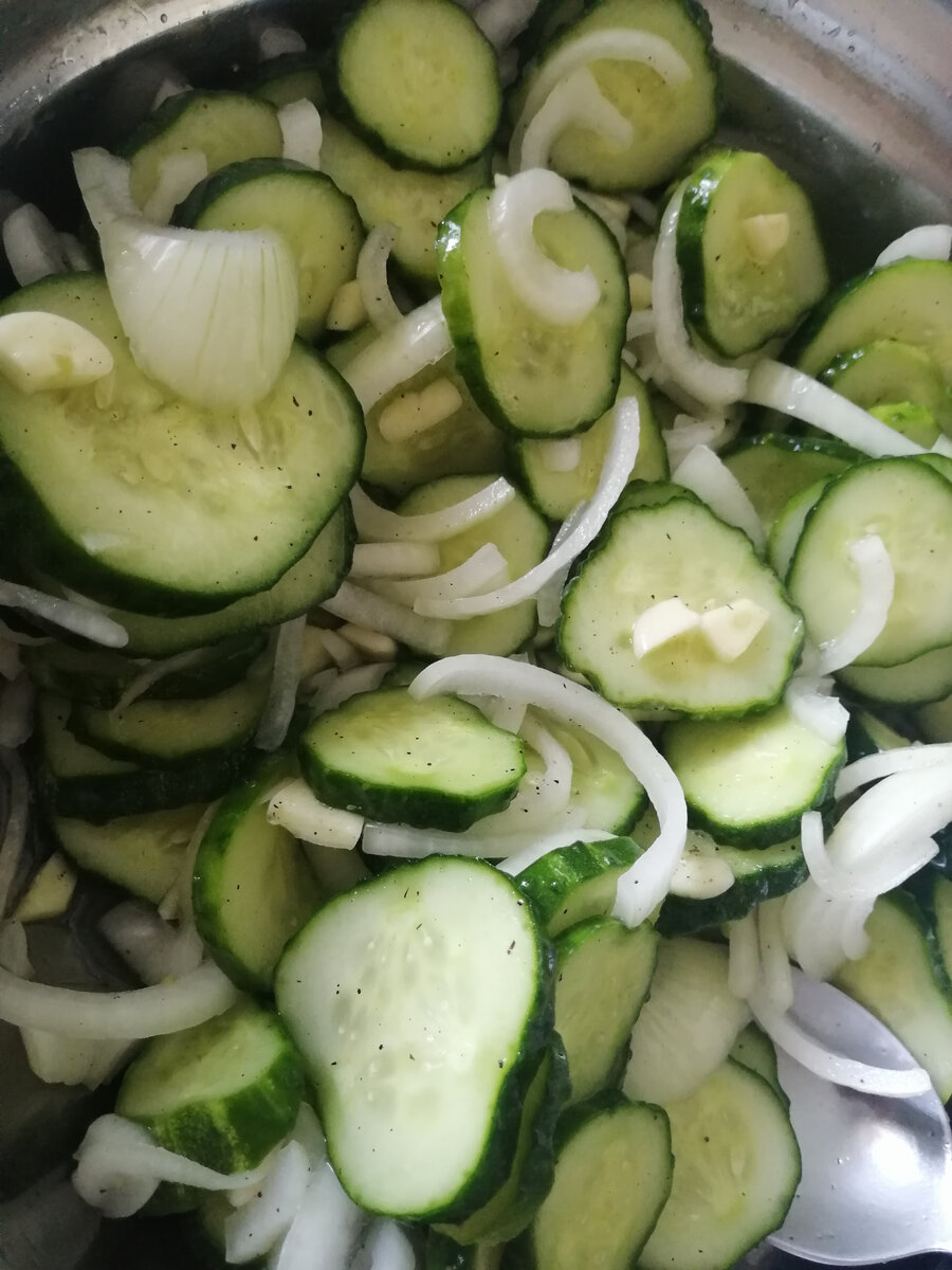 Вам понадобится: 1. Огурцы = 6 штук крупных. 2. Белый лук = 2 головки средние. 3. Чеснок = 6 крупных зубчиков. 4. Перец черный молотый = 1/2 чайной ложки. 5. Соль = 1/2 столовой ложки. 6. Сахар = 1 столовая ложка. 7.Уксус (70%) = 1 столовая ложка. Приготовление: 1. Огурцы нарезаем кружками, лук кольцами, чеснок кубиками мелкими и перемешиваем. 2. Далее засыпаем соль, сахар, перец и добавляем уксус. 3. Даём настояться салатику минут 10 в холодильнике и вкуснотища готова. Можно такую закуску сделать в большем объеме и переложить в стеклянные баночки, чтобы открыть в любое время и покушать. "приятного аппетита"