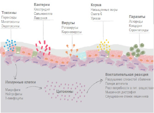 Воспаление – важный защитный механизм иммунной системы, который включается сразу после распознания антигена. Данный механизм стимулирует выработку активных молекул и клеток для поддержки основного противовоспалительного фактора – макрофагов. Барьеры организма (кожный покров, слизистая оболочка кишечника, слизистые респираторных органов) имеют постоянный непосредственный контакт с окружающей средой и, следовательно, с различными антигенами. Воспаление может быть косвенно вызвано стрессом, напрямую через повреждение тканей или инфицирование патогенами, включая вирусы, бактерии и паразиты. Также причиной воспаления могут быть компоненты корма, которые в определенных условиях, являются провоспалительным фактором. Что касается ЖКТ, согласно Niewold (2012) метаболическое воспаление – нормальная реакция организма на прием пищи. Иммунная система должна мгновенно “решить” допустимы ли проникшие внутрь соединения и микроорганизмы или с ними необходимо бороться. Таким образом, ткани, контактирующие с окружающей средой, менее чувствительны, чем другие органы, но наделены важной особенностью, а именно, выступают первым барьером. Субвоспалительные процессы протекают непрерывно, иммунная система постоянно активна, что может привести к возникновению гиперреакцию воспалительного механизма.