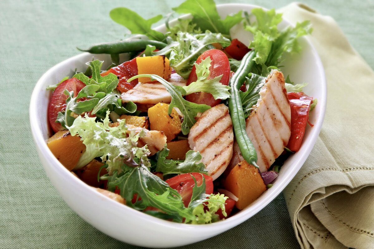 Яркость красок этого салата напоминает о лете, его приятно сделать зимним вечером и насладиться запоминающимся вкусом. Гранатовый сок отлично сочетается с йогуртом, а авокадо дополнительно насыщает организм нужными микроэлементами. Потребуется: • По 200 г куриного филе (нужно копченое), салата Айсберг • Авокадо • Моцарелла • Небольшая хурма • Миндальная стружка, йогурт, лимонный сок, гранатовый сок, зерновая горчица Приготовление: 1. Курицу нарезают кусочками. Хурму промывают и режут брусочками. Моцареллу раздавливают ножом и делят на куски. 2. Миндальную стружку прожаривают до золотистого состояния. Авокадо очищают, режут соломкой, сбрызгивают соком лимона – так нежная мякоть не потемнеет. Айсберг рвут руками на кусочки. 3. Стакан йогурта смешивают с соком лимона, гранатовым соком, добавляют горчицу – получилась заправка. Хурму смешивают с авокадо, куриным филе, салатными листьями. Салат перед подачей заправляют, укладывают сверху кусочки моцареллы, посыпают миндальной стружкой.