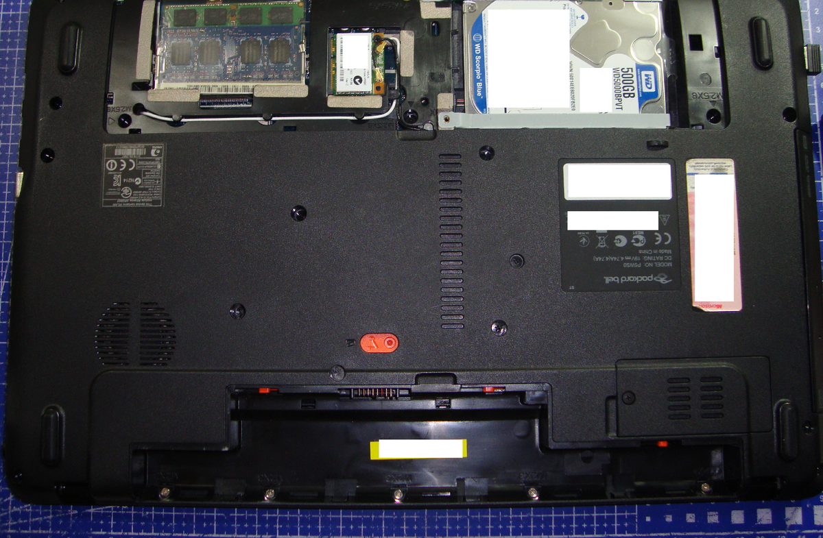 Модификаций данного ноутбука относительно много и представитель одной из них (модель P5WS0) оказался на моем операционном столе. Уже упомянул в короткой предыдущей части о том, что по словам хозяйки ноутбук "пошел на взлет", т.е. часто и громко начал шуметь вентилятор охлаждения. Если отбросить варианты с неисправностью электронной части, остается две наиболее вероятные причины - забит радиатор или проблема с вентилятором. В-общем, разбирать в любом случае. Как таковое подобное решение компоновки немного раздражает - для того, чтобы получить доступ к элементам, которые наиболее вероятно будут обслуживаться заметно чаще других, надо разобрать ноутбук полностью, тем более, что пообещали два яблока за это (не знаю, почему четное количество)... Вытаскиваем батарею, сдвинув, например, отверткой, оранжевый фиксатор. Откручиваем два болта крышки над оперативной памятью и накопителем HDD. Кстати, винчестер вытягивается с усилием, но сломать что-то там, я думаю, практически невозможно Болтики