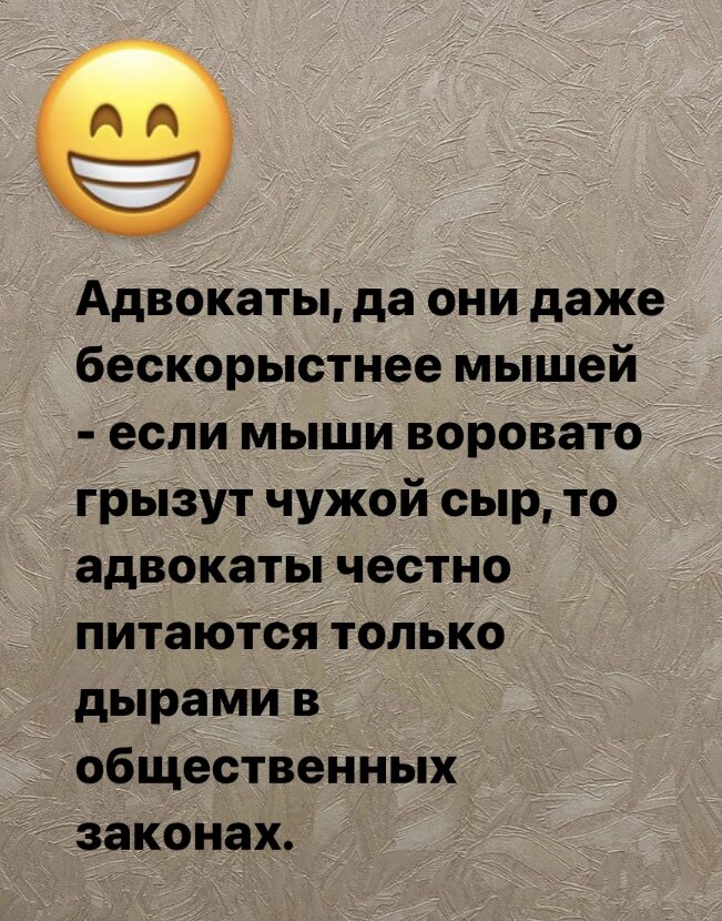 Встречайте подборку анекдотов про юристов. Прибегает молодой сын-юрист к старому отцу-юристу и кричит: - Отец, поздравь меня! Я выиграл дело, которое ты не мог выиграть всю свою жизнь! А тот ему в ответ: - Вот дурак, да я с него всю свою жизнь кормился! ********** Женщина приходит к адвокату и спрашивает: - Это, правда, что при разводе можно получить половину состояния мужа? - Если все сделать грамотно, то да, такое возможно. А почему вы хотите развестись? - Да нет, я пока ещё только хочу найти подходящего мужа. ********** Юрист говорит клиенту: - Незнание закона не освобождает от ответственности, а вот знание - да! ********** Мясник приходит на приём к юристу: - Скажите, если собака стащила с моего прилавка кусок мяса, обязан ли её хозяин уплатить мне? - Безусловно! - Ваша собака пять минут назад схватила с моего прилавка здоровенный бифштекс. - Отлично, если вы принесёте мне ещё один такой же бифштекс, он как раз и составит мой гонорар за юридическую консультацию.